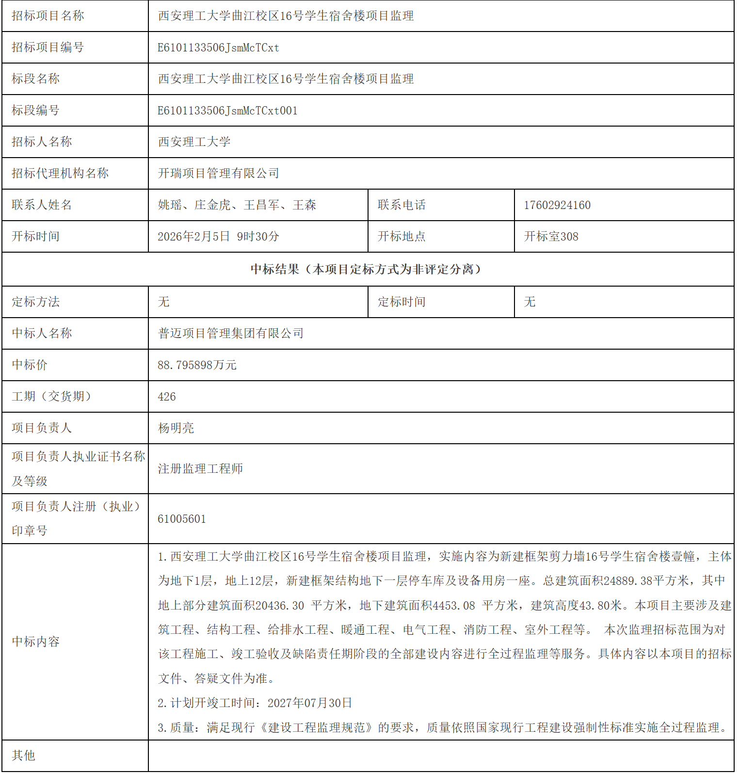 【监理服务】西安理工大学曲江校区16号学生宿舍楼项目监理中标结果公告